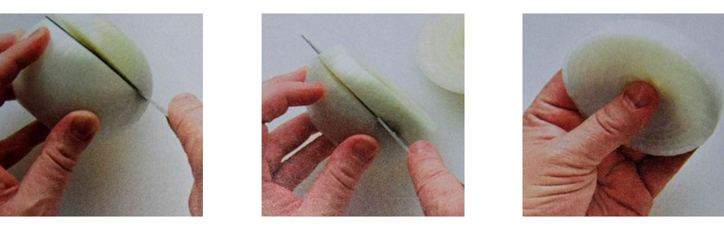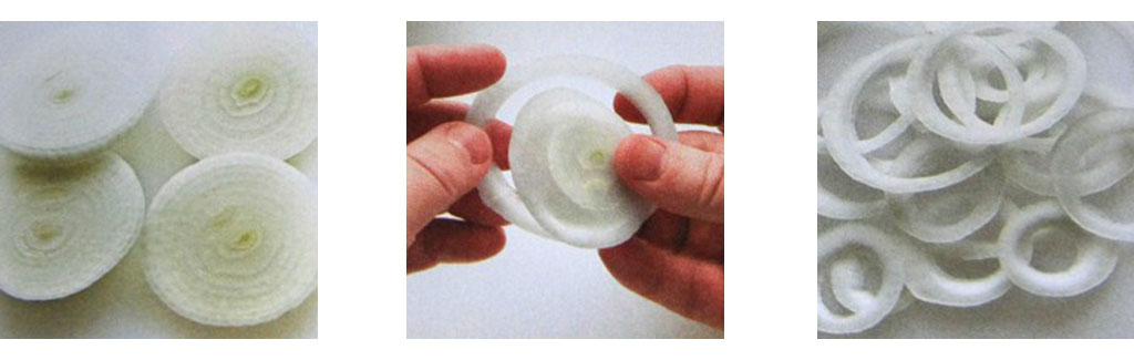 Этот способ нарезки применяется для слоистых и полых овощей, как, например, лук или перец. Лук нарезают тонкими кольцами, которые потом аккуратно разделяются по слоям на кружочки.
