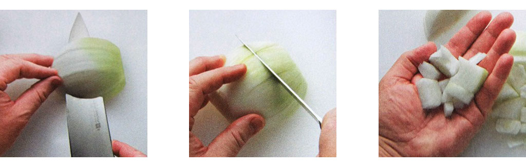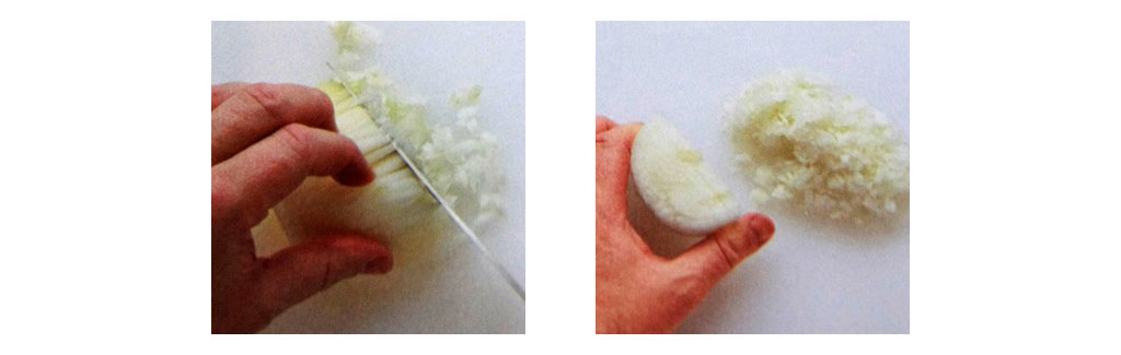 Эта техника применяется к репчатому луку и луку шалот и позволяет нарезать луковицу очень очень мелко.