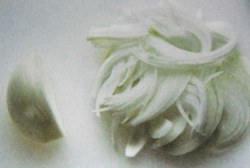 Этот способ нарезки применяется для слоистых и полых овощей, как, например, лук или перец. Лук нарезают тонкими кольцами, которые потом аккуратно разделяются по слоям на кружочки.