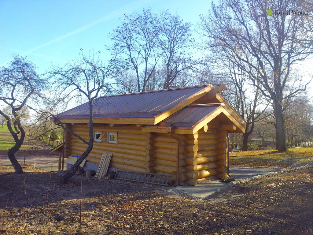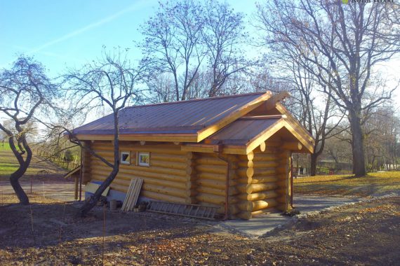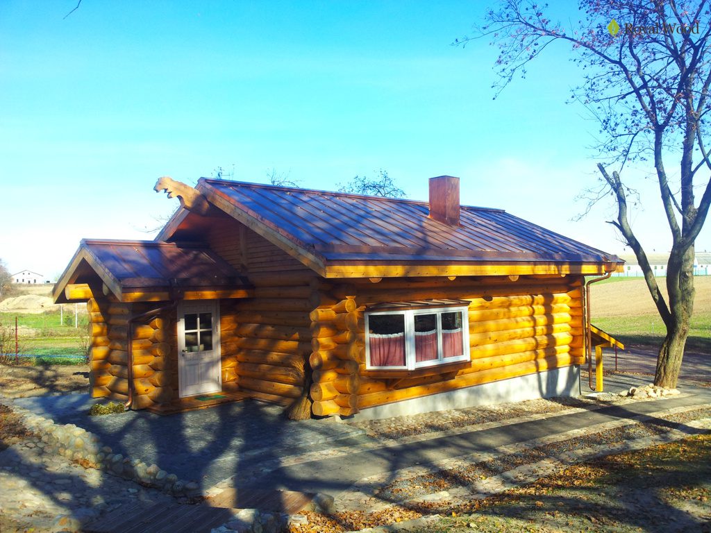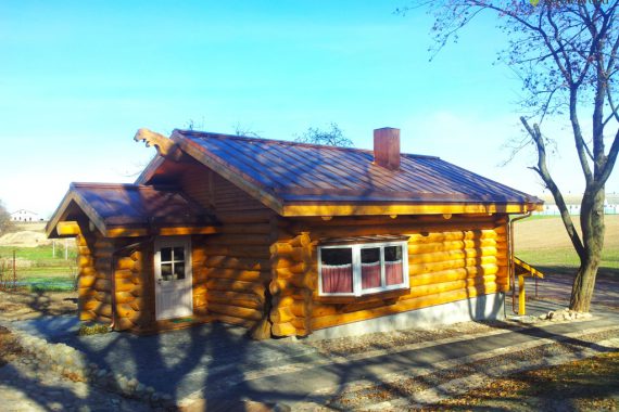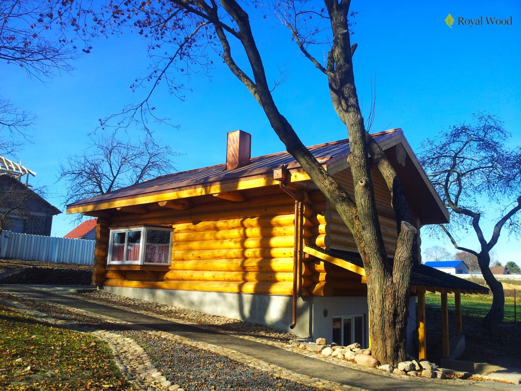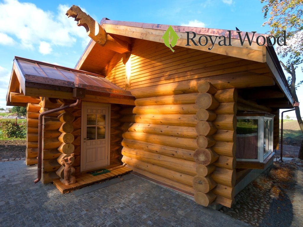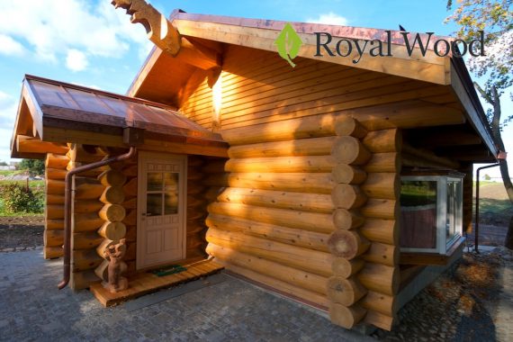 Снаружи сруб из красного канадского кедра выполнен в традиционном стиле: большие свесы кровли, защищающие стены от осадков, двухскатная кровля, покрытая медью, конек над входом в баню украшен декоративной фигурой, вырезанной также из красного кедра с конем. Это дань славянской традиции. Наши предки украшали свои жилища различными фигурами. Конь — это символ солнца, солярный знак, главный защитник русской избы от злых сил. Фронтоны бани выполнены по безусадочной технологии post and beam, что позволяет добиться равномерной усадки сруба во всех его частях и избежать щелей и перекосов бревен, что обычно случается, если выводить сруб под конек. Нагрузка кровли распределяется равномерно на весь периметр сруба. Фронтоны утеплены и зашиты изнутри и снаружи сосновной вагонкой, уложенный внахлест («елочкой»).