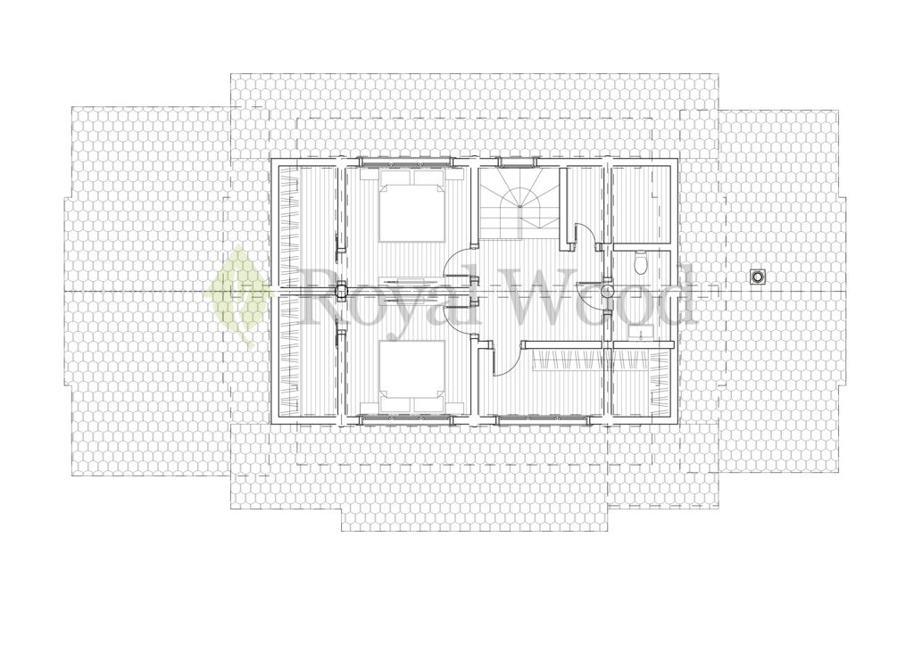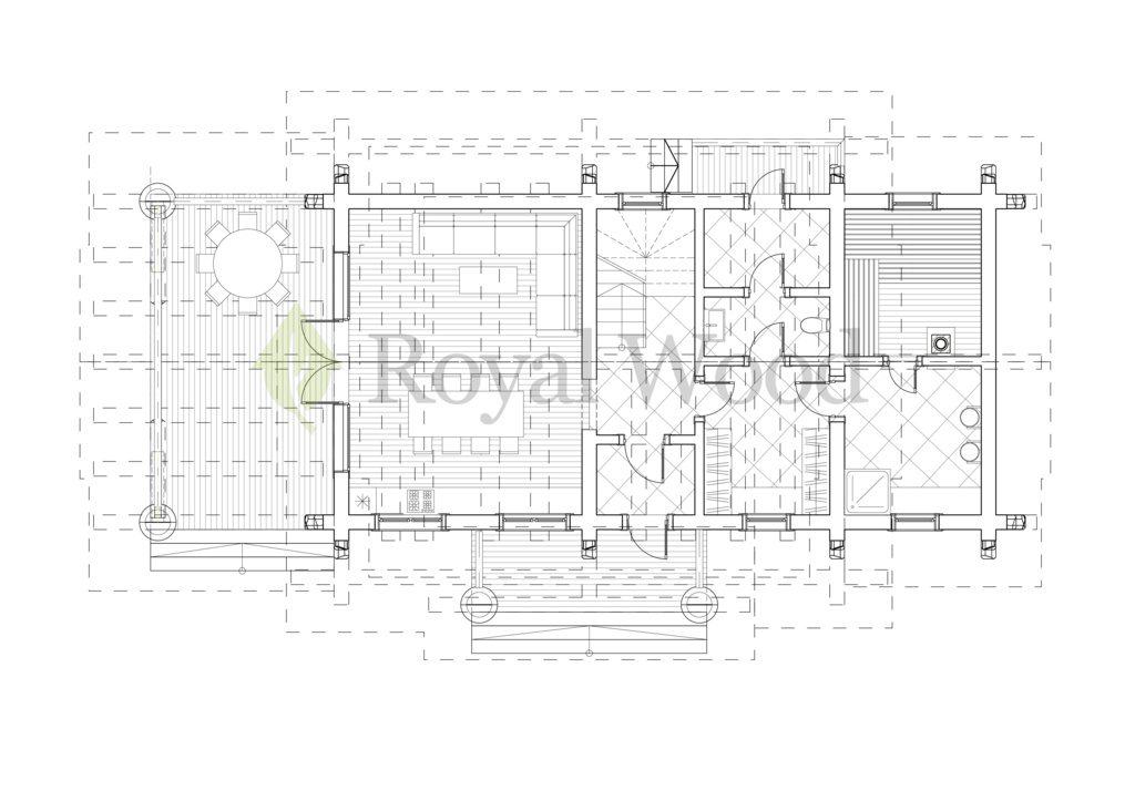 Первый этаж дома выполнен целиком из массива кедра средним диаметром 36 см и выше, рубка в канадскую чашу. Для тех, кто хочет получить более рустикальный и брутальный внешний вид – мы предлагаем производство дома из более крупного диаметра с применением бриллиантовой рубки. Мансардный этаж, а также терраса выполнены с применением безусадочной канадской технологии post and beam. Для конструкции применяются массивные деревянные балки и колонны диаметром 40 см и выше.