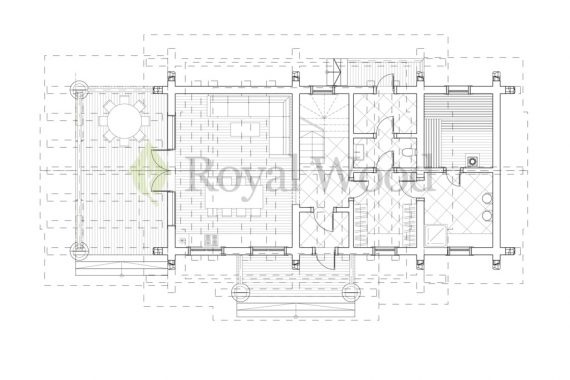 Первый этаж дома поделен на две зоны. Одну половину дома занимает просторная гостиная, объединенная с кухней и большая крытая терраса. Терраса дома с массивными колоннами и фермами, несомненно, является украшениме дома и придает проекту особый шарм. Несомненно, в весенне – летний период времени терраса дома будет чрезвычайно популярна у будущих владельцев.