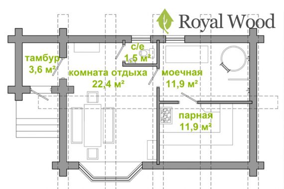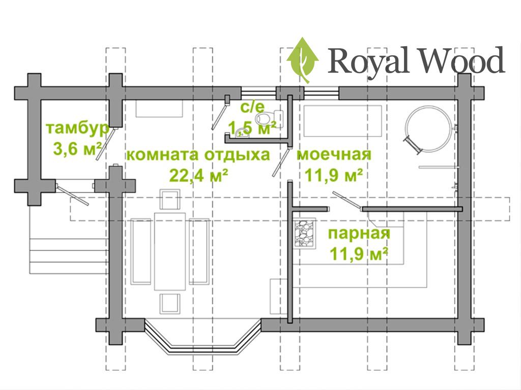 Войдя в баню, мы сразу же попадаем в тамбур – необходимый атрибут каждого здания и, особенно, – бани. Тамбур отсекает холодный воздух с улицы, помогая дольше сохранить тепло внутри сооружения. Далее идет просторная и светлая комната отдыха с высоким потолком под крышу. Для естественного освещения в комнате отдыха предусмотрено большое окно-эркер, позволяющее насладиться красивым видом на сад. Из комнаты отдыха расположен вход в санузел. Санузел в бане небольшой по площади – 1,5 м², запроектирован с учетом размещения только самых необходимых сантехнических приборов – унитаза и умывальника. Следующее помещение, в которое мы попадаем – это моечная. В моечной расположена душевая, купель для окунания с холодной водой и скамья для массажа. Из душевой мы заходим в парную. Парная в этой бане большая, специально для его обогрева клиент заказывал индивидуальную печь, способную равномерно прогреть просторное помещение и создать необходимый пар.