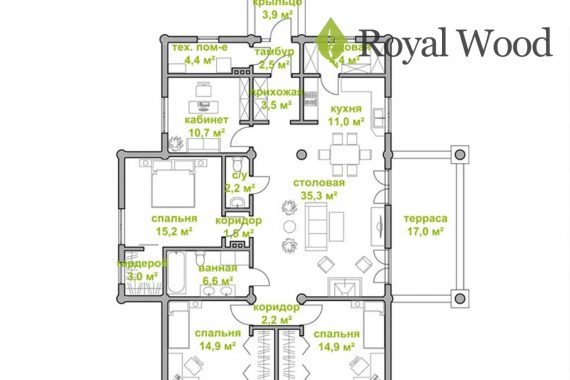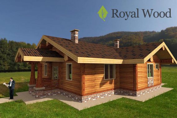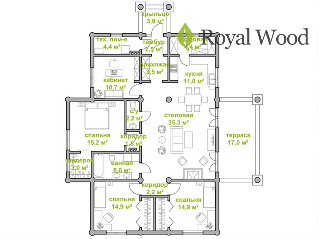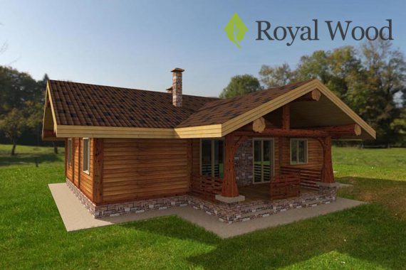 Проект дома «Уоллес» может быть построен как целиком из массива кедра с применением канадской рубки, так и по безусадочной технологии. Проект отлично подойдет в качестве основного или дачного дома для стандартной семьи. Дом одноэтажный. Вход дома украшен деревянной фермой с колоннами ручной рубки. Войдя в дом, вы попадаете в небольшой тамбур, откуда можно попасть в прихожую и топочную. Далее идет просторная гостиная, совмещенная с кухней и столовой общей площадью 46 м². В доме расположен три спальни. Одна спальня хозяйская с отдельной гардеробной и две детские со встроенными шкафами. В доме также есть одна большая ванная комната и один санузел. Архитекторы также предусмотрели наличие кладовой рядом с кухней и рабочего кабинета. Из гостиной есть выход на просторную террасу.