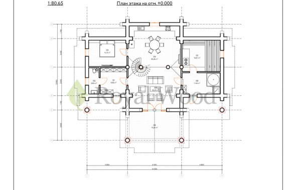 Вход в дом расположен по левую сторону от террасы. Зайдя в дом, вы попадаете в просторный тамбур с гардеробной. Слева размещен гостевой санузел. Из гардеробной вы попадаете в потрясающий зал с винтовой лестницей и камином. Здесь гостиная объединена с кухней и столовой зоной. Второй свет и наличие большого количества окон до пола создает эффект еще большего пространства. Гостиная выглядит богато и уютно одновременно. Из гостиной также есть выход на террасу, на которой можно расположить барбекю и на которой владельцы дома, наверняка, будут проводить большую часть времени в весенне — летний период года.