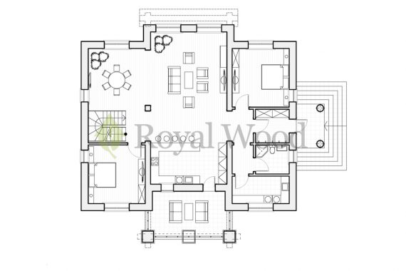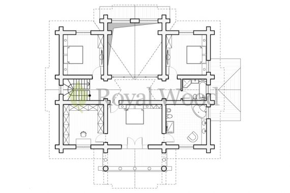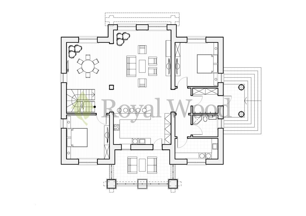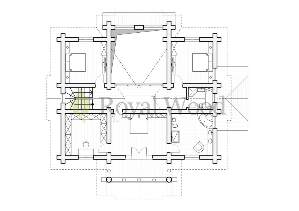 Особенной чертой данного проекта является наличие второго света над гостиной, что добавляет этому помещению объема и света. Проект выполнен по классической технологии канадской рубки с применением элементов безусадочной канадской технологии post and beam.