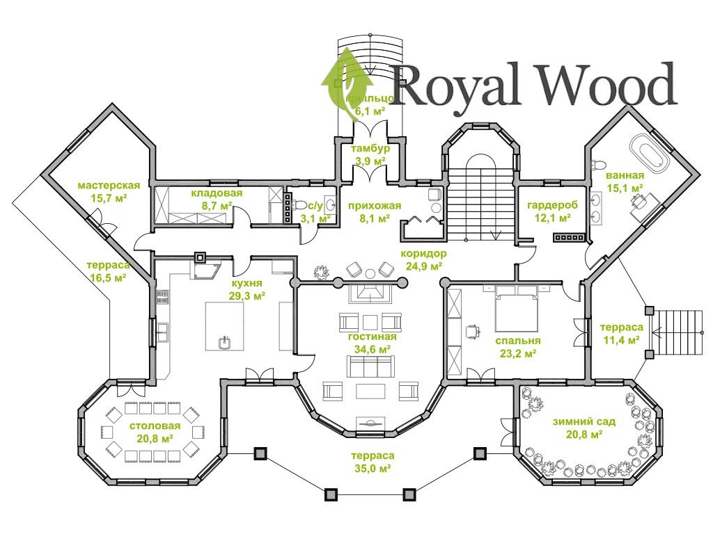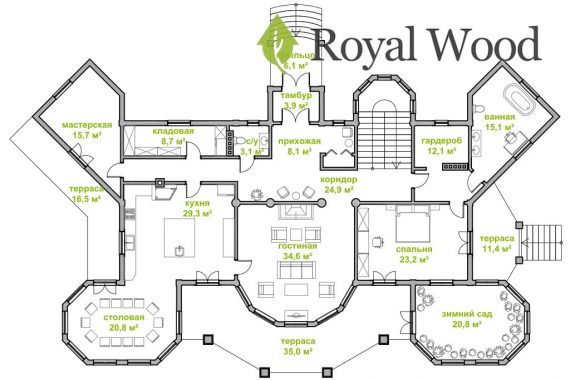Из тамбура мы попадаем в прихожую с гардеробной и уютным диваном для ожидания. Далее — мы попадаем в просторную гостиную с эркером и максимальной площадью остекления. Из гостиной предусмотрен выход на террасу. Кухня и столовая расположены в правой части здания, из столовой также предусмотрен выход на террасу. Левое крыло дома занимает гостевая спальня с выходом в зимний сад и террасу. В этой части здания расположены также санузел и гардеробная.