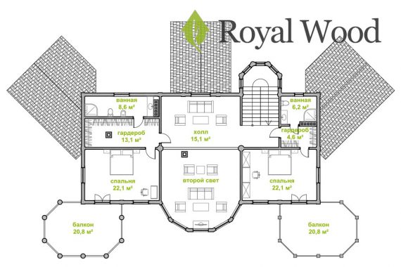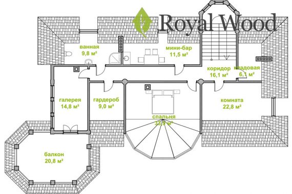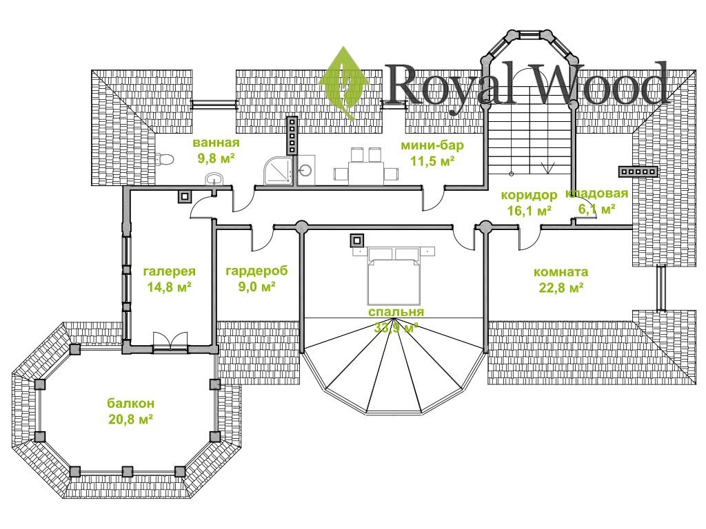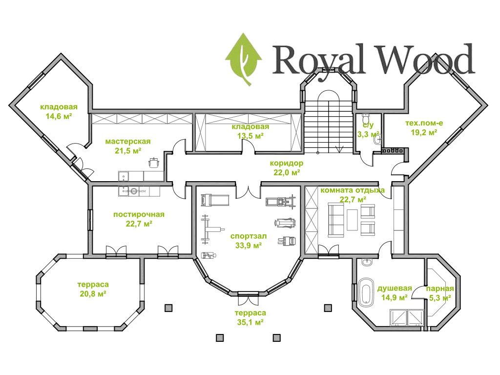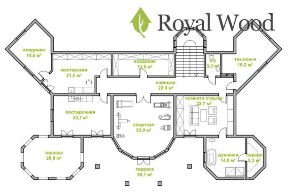 Второй этаж усадьбы отведен для отдыха и занятия спортом и любимыми хобби. Здесь расположен тренажерный зал с комнатой массажа и отдыха, а также парная и душевая комнаты. Также на этом этаже расположена мастерская, кладовая и техническое помещение. Для стирки и уборки предусмотрена большая постирочная комната, которая также может использоваться для иных целей.