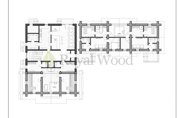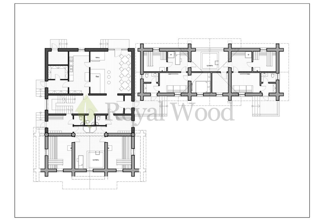 Комплекс разделен на два крыла. В левом крыле расположена зона отдыха и развлечений для большой компании. Это большая гостиная зона совмещенная со столовой. В центре гостиной- массивный камин, сложенный из натурального камня. Из гостиной гости попадают на просторную крытую террасу с зоной барбекю.