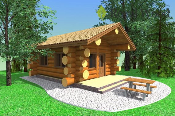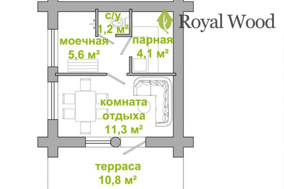 Великолепный проект отдельностоящей одноэтажной бани площадью 33 м². Баня подойдет для комфортного отдыха компании, состоящей их 4-5 человек. В проекте предусмотрена достаточно просторная комната отдыха, в которой можно расположить небольшую кухню или столовую с диваном. Перед входом в гостиную архитекторы предусмотрели большую террасу — именно на ней можно проводить большую часть времени общаясь с семьей и друзьями. На террасе можно разместить обеденный стол, небольшое барбекю или расположить несколько шезлонгов. В качестве варианта — на террасе можно установить деревянную купель. Летом в купель можно заливать холодную воду, а зимой — теплую.
