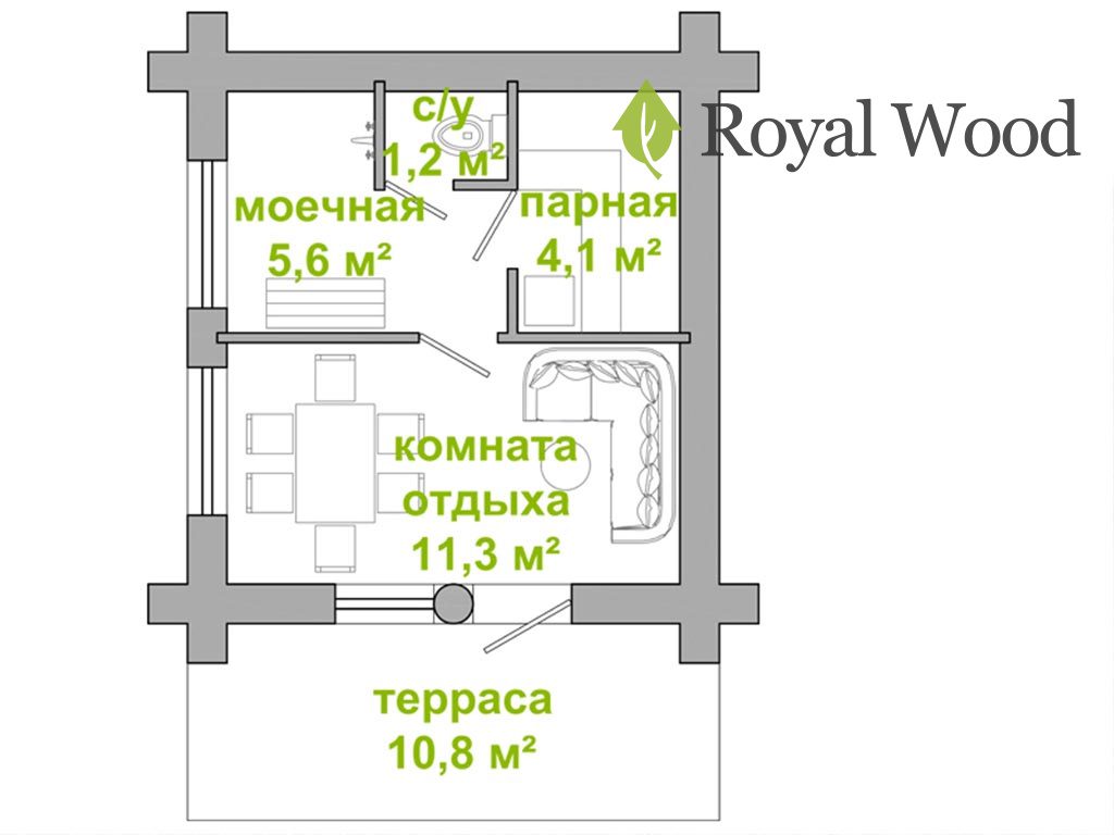 Из комнаты отдыха вы попадаете в моечную, напротив — располагается парная с «г-образным» рапсоложением полков. В деревянной бане также предусмотрен санузел.