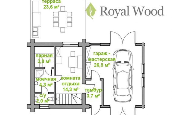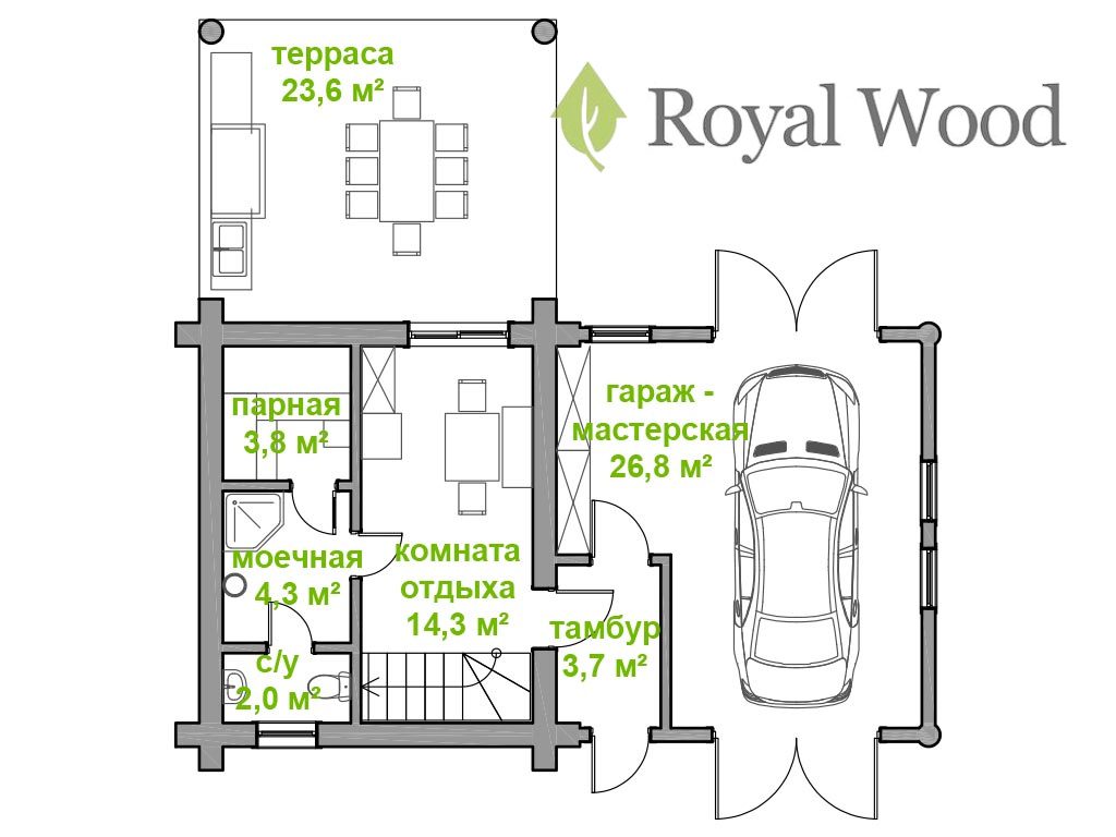 На первом этаже расположен полноценный гараж с ямой для технического обслуживания авто. Когда авто не находится в гараже — это помещение можно использовать в качестве столярной мастерской. Остальная часть первого этажа отдана под спа — зону. Здесь мы расположили совсем небольшие по площади помещения парной, душевой, санузла и гостиной. Из комнаты предусмотрен выход на просторную террасу, на которой можно разместить купель и летнюю кухню. Стоимость террасы намного ниже стоимость строительства крытого контура дома, поэтому площадь террасы достаточно большая — 23м².