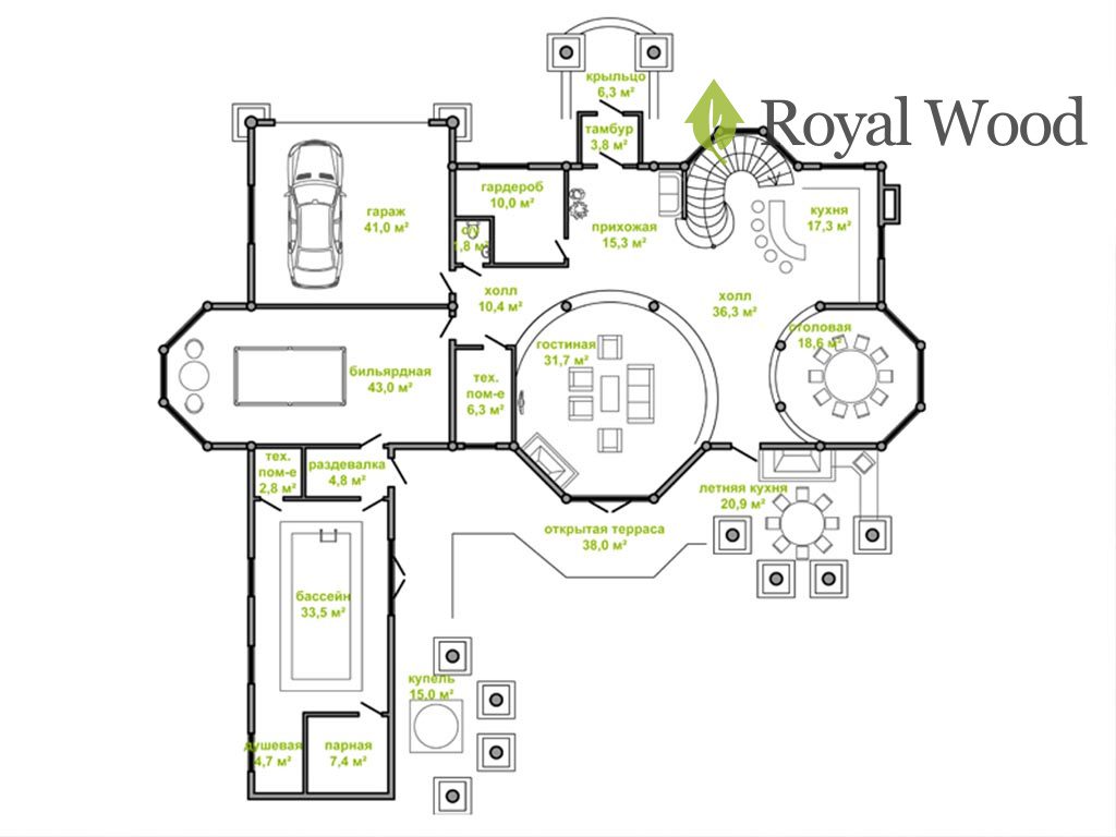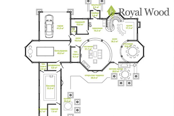 В противоположной части здания находится гараж с хозяйственными помещениями и зона активного отдыха: бильярдная, бассейн и парная с открытой купелью на террасе. Эта часть дома одноэтажная и максимально удалена от остальных помещений, так как, кроме различного влажностного и температурного режима, эти комнаты еще и достаточно шумные.