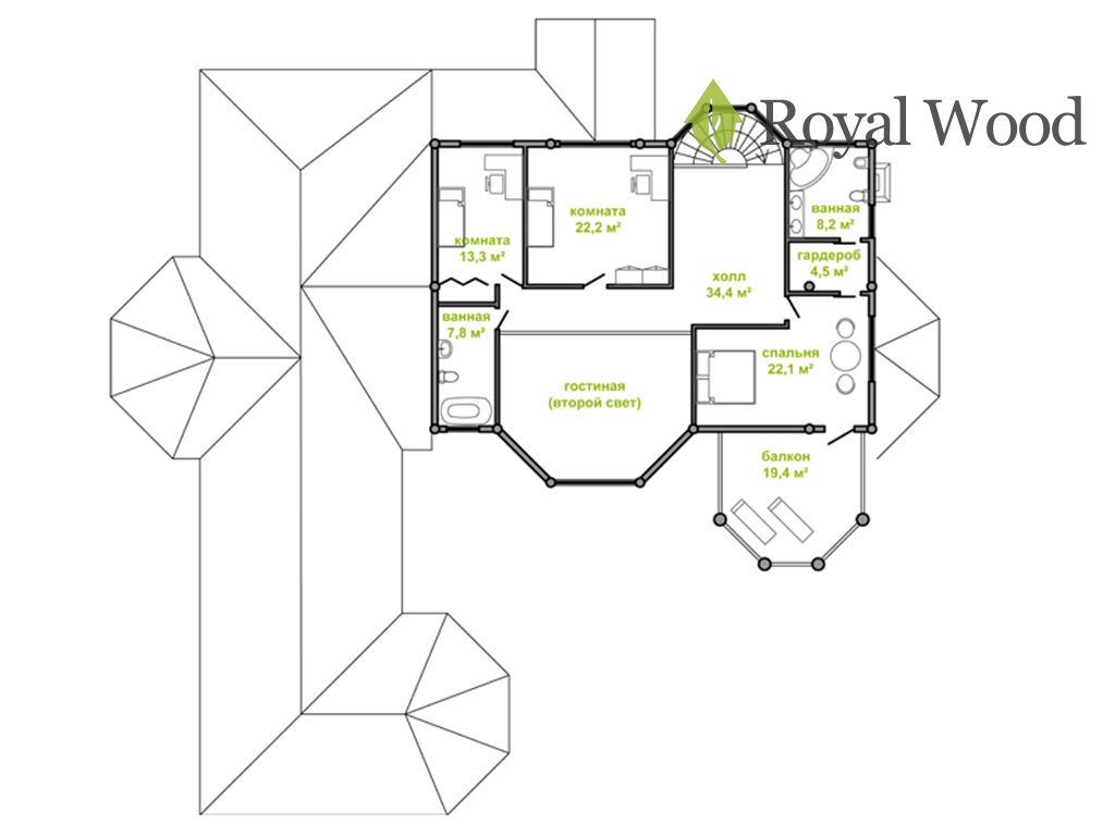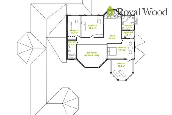 Парадный вход с большим навесом встречает посетителей со стороны улицы и спасает от непогоды. Из прихожей мы попадаем в просторную и светлую гостиную со вторым светом. Гостиная с большим уютным камином и выходом на террасу располагается на две ступени ниже остальных помещений, создавая тем самым дополнительный комфорт и уединение для отдыхающих. Рядом с гостиной запроектирована кухня с барной стойкой и столовая на десять человек. Столовая приподнята относительно основного объема первого этажа и отделена от гостиной колоннами. Благодаря своей конфигурации и панорамным окнам создается впечатление, что вы обедаете в комфортной беседке. Между кухней и прихожей располагается красивая винтовая лестница, выступающая на фасаде эркером.