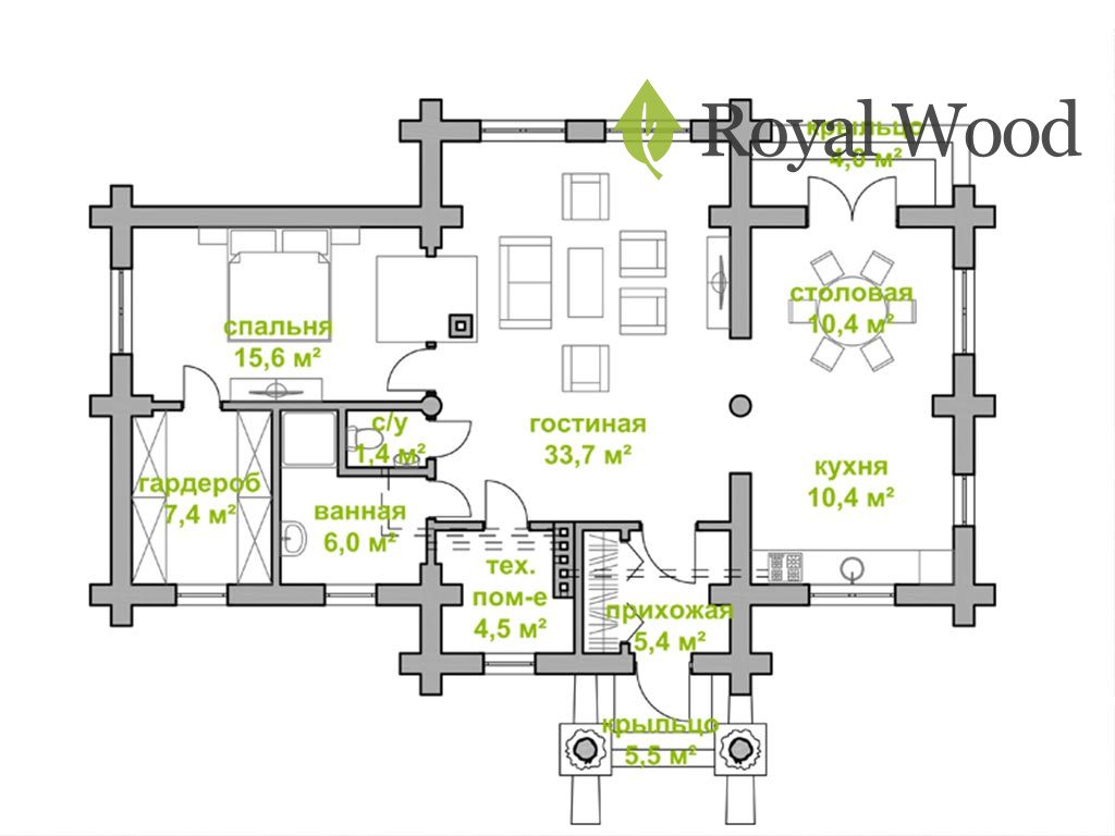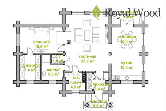 Между гостиной и спальней архитекторы будет располагаться настоящая русская дровяная печь с лежанкой, которая придаст дому уют и особую домашнюю атмосферу. Печь также играет важную функцию, с ее помощью можно быстро и без труда отопить гостиную и спальню в доме, без использования электричества. В доме планирует постоянно проживать супружеская пара. Для нее предусмотрена уютная спальня с просторной гардеробной. Зона столовой и кухню объединены с гостиной, за счет чего создается ощущение большого пространства. Благодаря раздвижной системе патио, можно с легкостью попасть из кухни на открытую террасу, перенести стол и устроить барбекю с друзьями прямо на открытом воздухе!