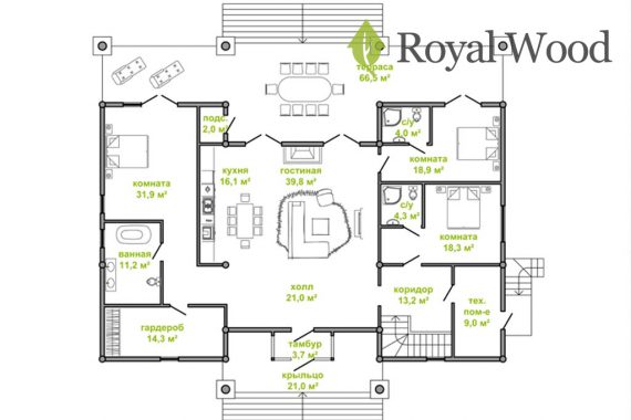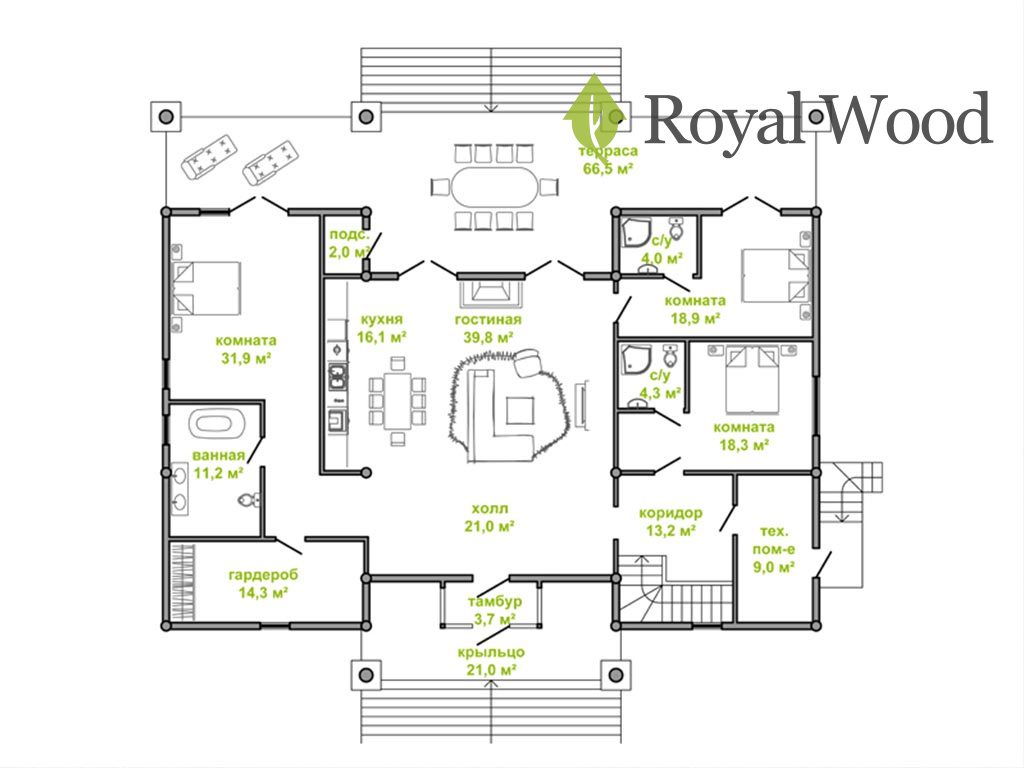 Проект дома «Кейсон» — воплощение благородной классики и комфорта. Площадь основного этажа, без учета цоколя, составляет 228 м². В сердце дома — просторная гостиная, совмещенная с кухней. Центральное место в гостиной занимает большой камин, распашные окна- патио с обеих сторон камина, дают комнате максимум естественного освещения и расширяют помещение визуально. В доме имеется три спальни с отдельными санузлами, в хозяйской спальне предусмотрена вместительная гардеробная и ванная комната, в которой можно разместить небольшую сауну. На просторной террасе, выходящей на юг, можно проводить массу приятных часов, в компании семьи и друзей. Площадь террасы позволит разместить не только обеденный стол, но также шезлонги, барбекю или детский бассейн. В техническом помещении первого этажа возможно расположить топочную или постирочную комнату. В данном проекте также имеется цокольный этаж, который можно приспособить под любые ваши нужды.