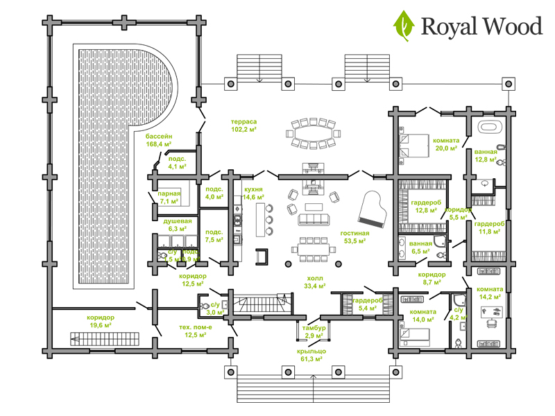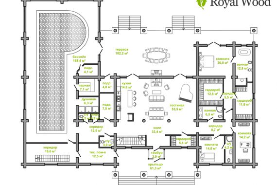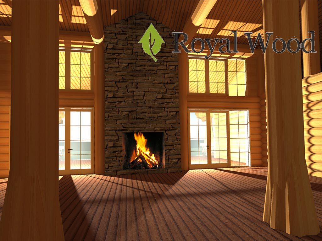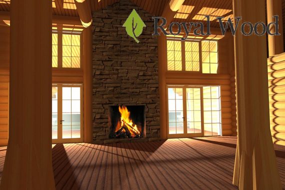 В центре плана первого этажа расположена огромная гостиная, совмещенная с кухней и столовой. Общая площадь этого пространства составляет более 100м². Центром гостиной стал царь-камин, выложенный натуральным камнем. Кухня островная, в лучших традициях американских и канадских зажиточных домов. В гостиной также нашлось место и для коллекционного рояля. Высокие потолки, арки, камин и колонны из массива кедра создают совершенно потрясающую атмосферу этого дома.